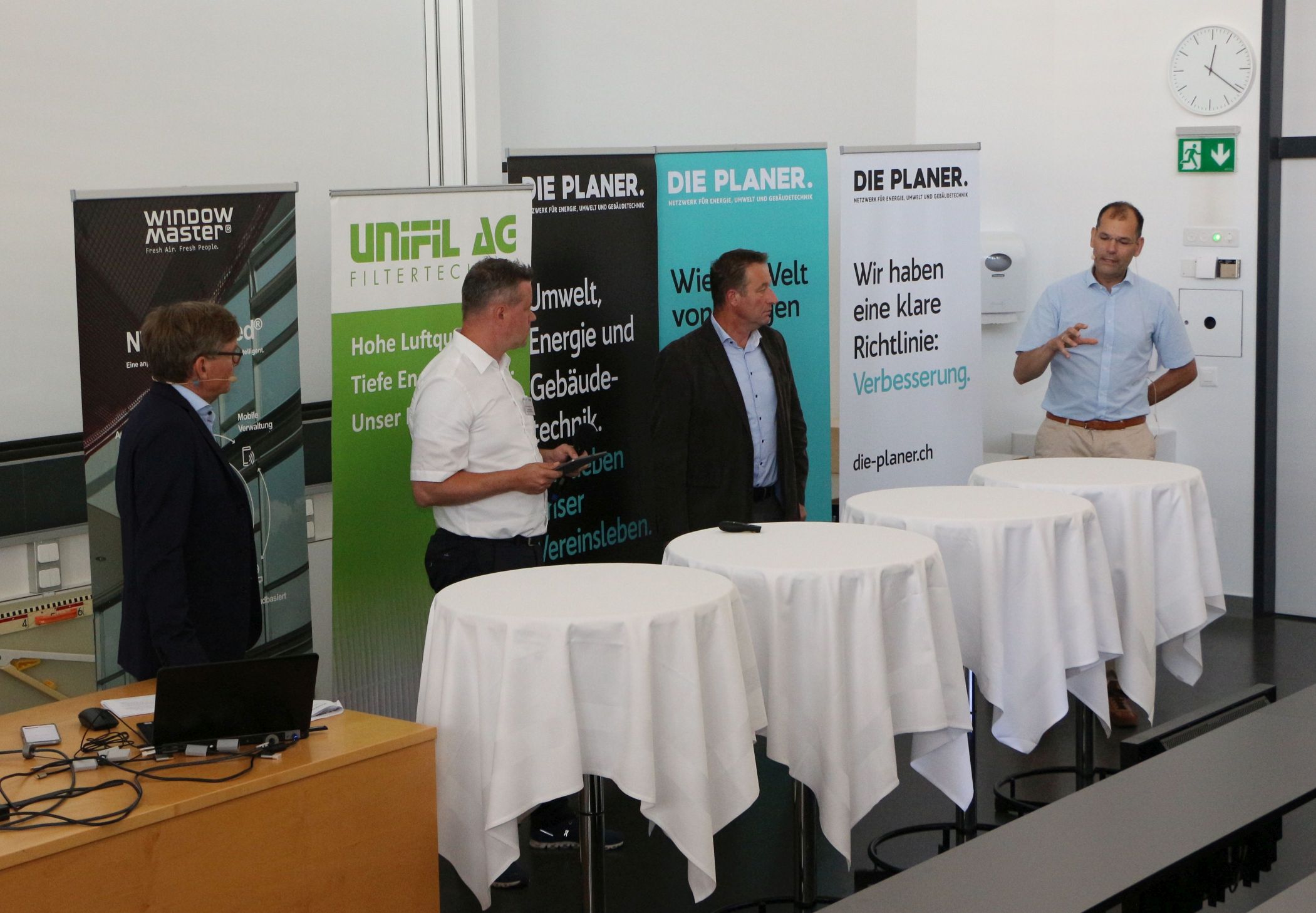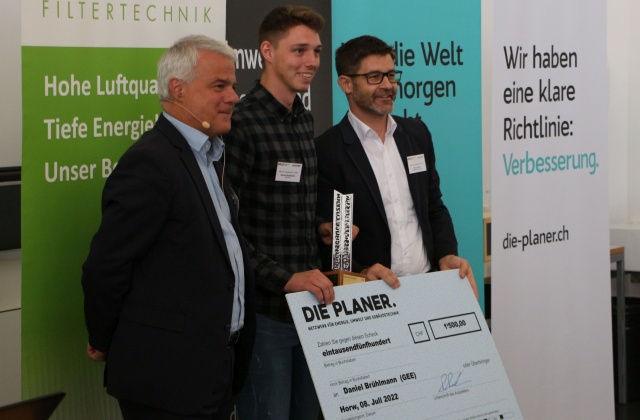 Der diesjährige Nachwuchspreis Gebäudetechnik ging an Daniel Brühlmann, Studierender im Studiengang Bachelor of Science (BsC) in Gebäudetechnik/Energie. Traditionsgemäss stellten ausgewählte Absolventen ihre Diplomarbeiten vor. Joel Pfister und Stefan Bieri (BSc IGE GEE) überprüften u.a. eine ökologische und sinnvolle Speicherung der Überproduktion aus einem Photovoltaik-Projekt eines benachbarten Gewerbebetriebs (Autogewerbeverband), verglichen nachhaltige Speichertechnologien und bewerteten Eigenverbrauchsstrategien.