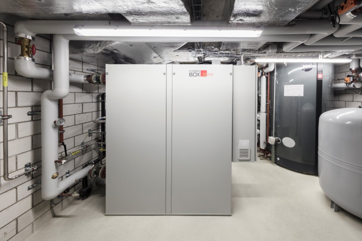 Mit der im UG installierten, so genannten, Hybridbox, einer Kombi-Energiezentrale aus Wärmepumpe und Mini-Blockheizkraftwerk, wird im Winter aus dem (erneuerbaren) Erdgas elektrischer Strom und Wärme bereitgestellt. (Bild: UWA)