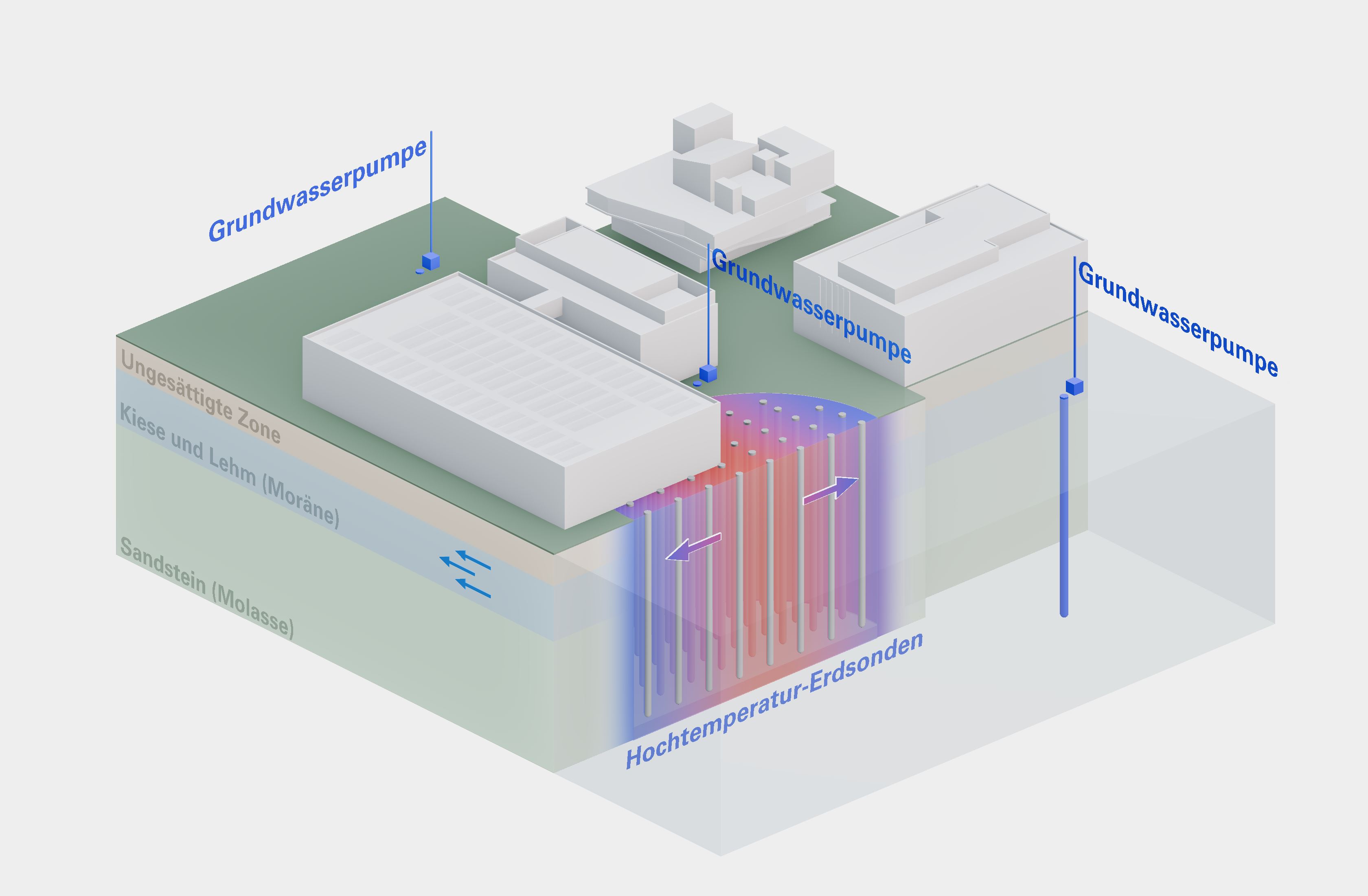 Klassische Erdwärmepumpen holen im Winter die Wärme aus dem Boden, um Gebäude zu heizen. Bei den auf dem Areal der Empa und der Eawag installierten Bohrloch-Wärmespeichern handelt es sich um Erdsonden, die nicht nur im Winter die Wärme an die Oberfläche holen können, sondern die Hitze aus den Sommermonaten in den Boden zurückführen, damit diese dann in der kälteren Jahreszeit zur Verfügung steht. Dabei können dem Speicher maximal Temperaturen bis zu 65 Grad Celsius zugeführt werden. Ein Rekord in der Schweiz und damit im Land einzigartig. Das führt dazu, dass lokal im Boden im Schnitt bis zu 50 Grad Celsius erreicht werden können.