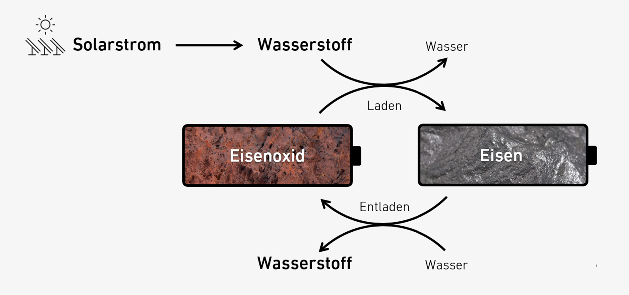Um Wasserstoff besser speichern zu können, stützen sich Stark und sein Team auf das Eisen-Dampf-Verfahren, das bereits seit dem 19. Jahrhundert bekannt ist. Wenn in den Sommermonaten zu viel Solarstrom vorhanden ist, kann damit Wasser aufgespalten werden, um Wasserstoff zu erzeugen. Dieser Wasserstoff wird dann in einen 400 Grad Celsius heissen Edelstahlkessel geleitet, der mit natürlichem Eisenerz gefüllt ist. Dort entzieht der Wasserstoff dem Eisenerz – das chemisch nichts anderes ist als Eisenoxid – den Sauerstoff, wodurch elementares Eisen und Wasser entstehen.