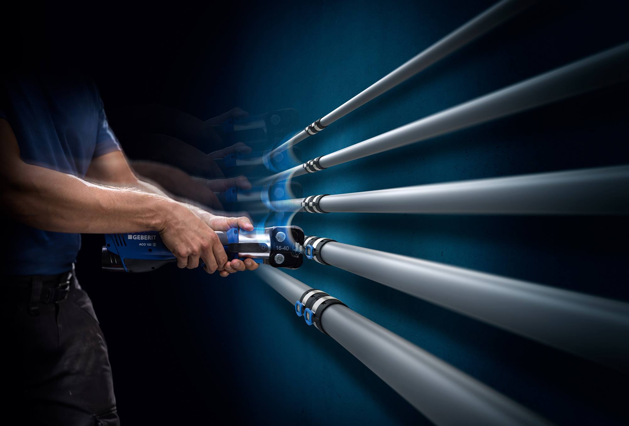 Geberit FlowFit erlaubt unterbrechungsfreie, wirtschaftliche Installationen: Für die acht Rohrdimensionen werden nur noch zwei Pressbacken benötigt. Eine Backe für d16d40 und eine Backe für d50d75 mm. So kann ein Mehrfamilienhaus komplett ohne Werkzeugwechsel realisiert werden. Schwere Pressschlingen kommen gar nicht mehr zum Einsatz. Ein Entgraten und Kalibrieren der Rohre ist nicht mehr notwendig.