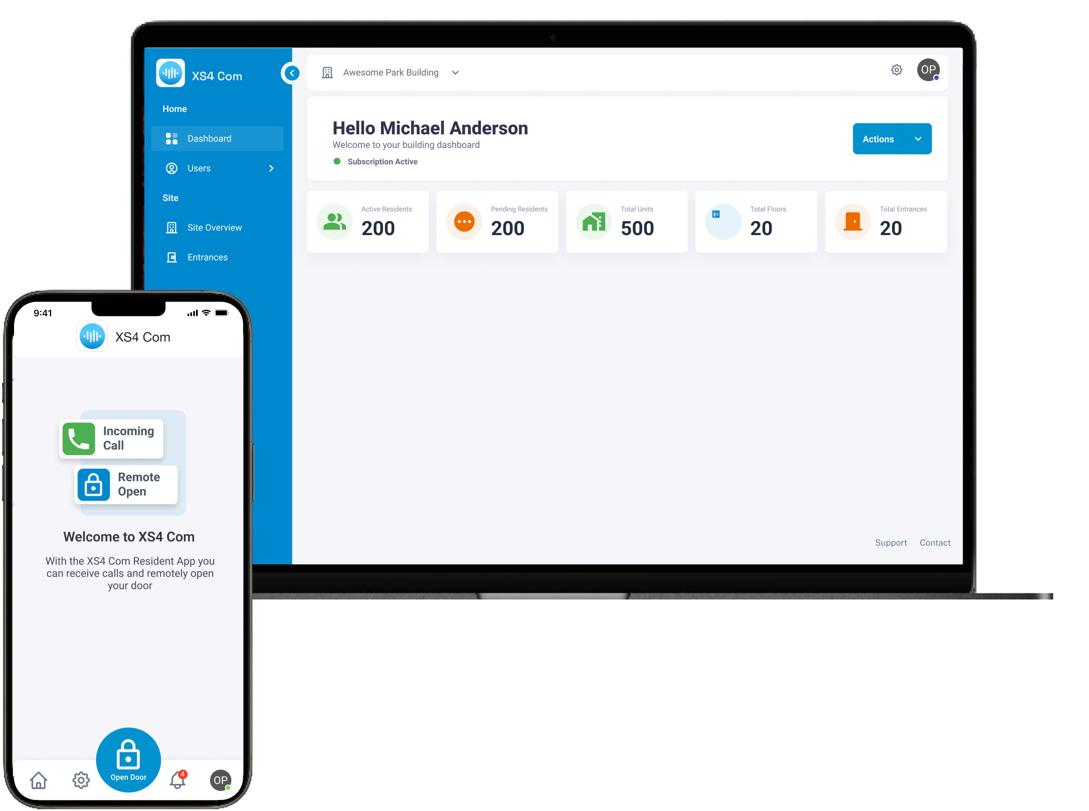 Zur Infrastruktur von XS4 Com gehören eine cloudbasierte Web App für die Administration, eine native Intercom-App für Gastgeber und XS4 Com iGO, das mittels QR-Code- und NFC-Technologie ein virtuelles Telefonbuch für Besucher bereitstellt.