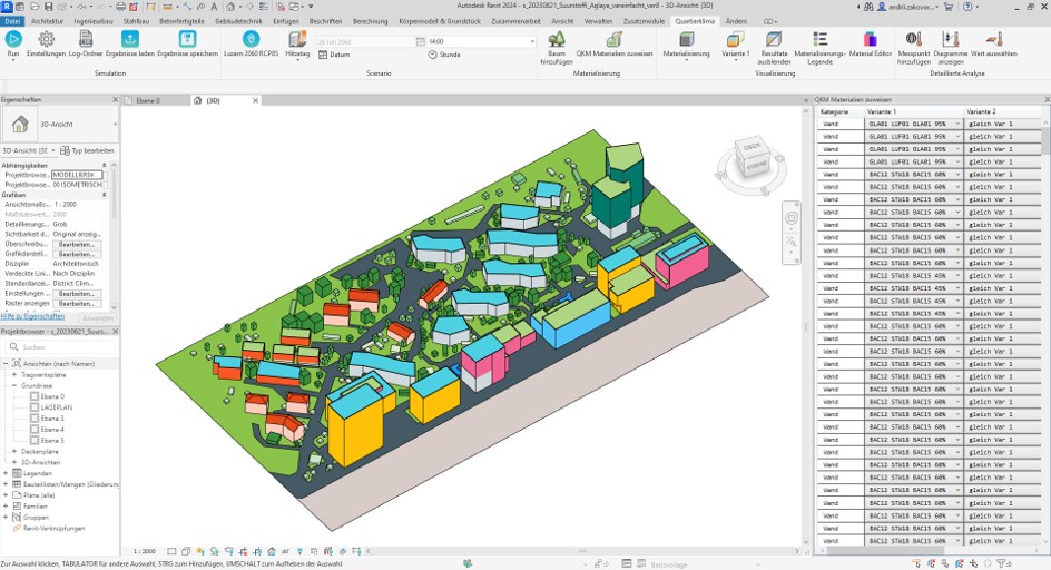 QKM ist ein Add-In für Revit® und liefert Resultate in wenigen Sekunden, was ein interaktives Arbeiten für Architekt:innen, Landschaftsplaner:innen und Fachplaner:innen ermöglicht. Für die Erstellung der Geländetopologie und dem Entwurf von Gebäuden und Bepflanzungen, wird die Funktionalität von Revit® genutzt. Die Flächen werden in einfacher Weise durch Materialdaten mit QKM verbunden.