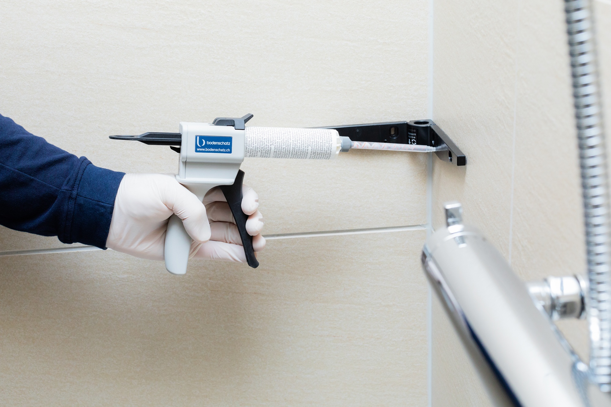 Eine einfachere, praktischere und flexiblere Lösung bietet das Montagesystem Adesio von Bodenschatz. Die seit sechs Jahren erhältliche Profi-Kleblösung lässt Wandplatten und Abdichtungen vollständig intakt. Damit erfüllt die Klebemontage mit Adesio zu 100 % die neue Norm SIA 271/1. Für die Montage ist einzig der Sanitärinstallateur zuständig – eine aufwendige Koordination der Gewerke ist nicht nötig.