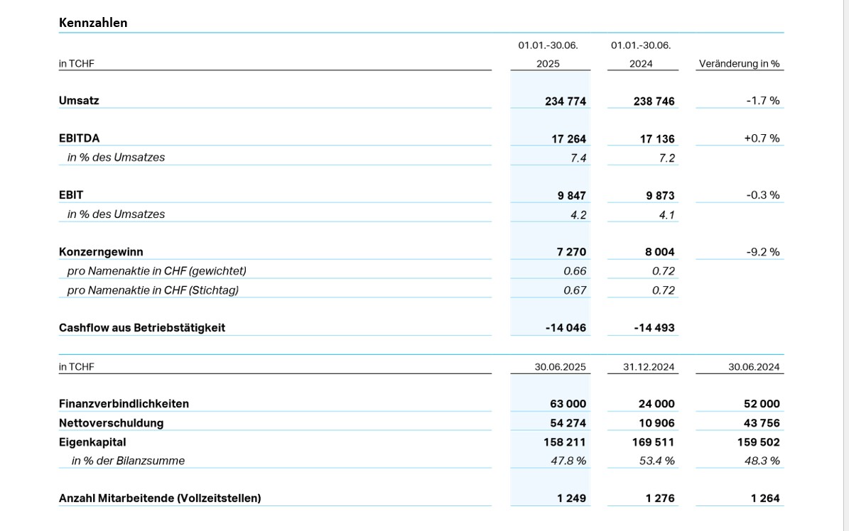 Meier Tobler erzielte im ersten Halbjahr 2025 einen Nettoumsatz von CHF 234.8 Mio. (Vorjahr: CHF 238.7 Mio.), was einem Rückgang um 1,7 % entspricht. Bereinigt um die durch den Verkauf der Meier Tobler Lüftungshygiene AG weggefallenen Umsätze betrug der Rückgang organisch 0,9 %. Roger Basler, CEO von Meier Tobler, sagt: «Der Schweizer Heizungsmarkt zeigte im ersten Halbjahr 2025 weiterhin keine wesentliche Erholung und entwickelte sich lediglich verhalten. Dennoch konnten wir die in den vergangenen Jahren erzielten operativen Fortschritte bestätigen.» Das im Jahr 2023 in Betrieb genommene Dienstleistungszentrum in Oberbuchsiten bietet hochwertige Logistikdienstleistungen und zeichnet sich durch eine stark gesteigerte Effizienz aus. Im Januar 2025 wurde das neue ERP-System SAP S/4HANA nach einer Projektzeit von knapp drei Jahren erfolgreich eingeführt. Es bietet eine moderne, integrierte Plattform für durchgängige Prozesse und unterstützt das Unternehmen im Rahmen seiner Digitalisierungsstrategie.