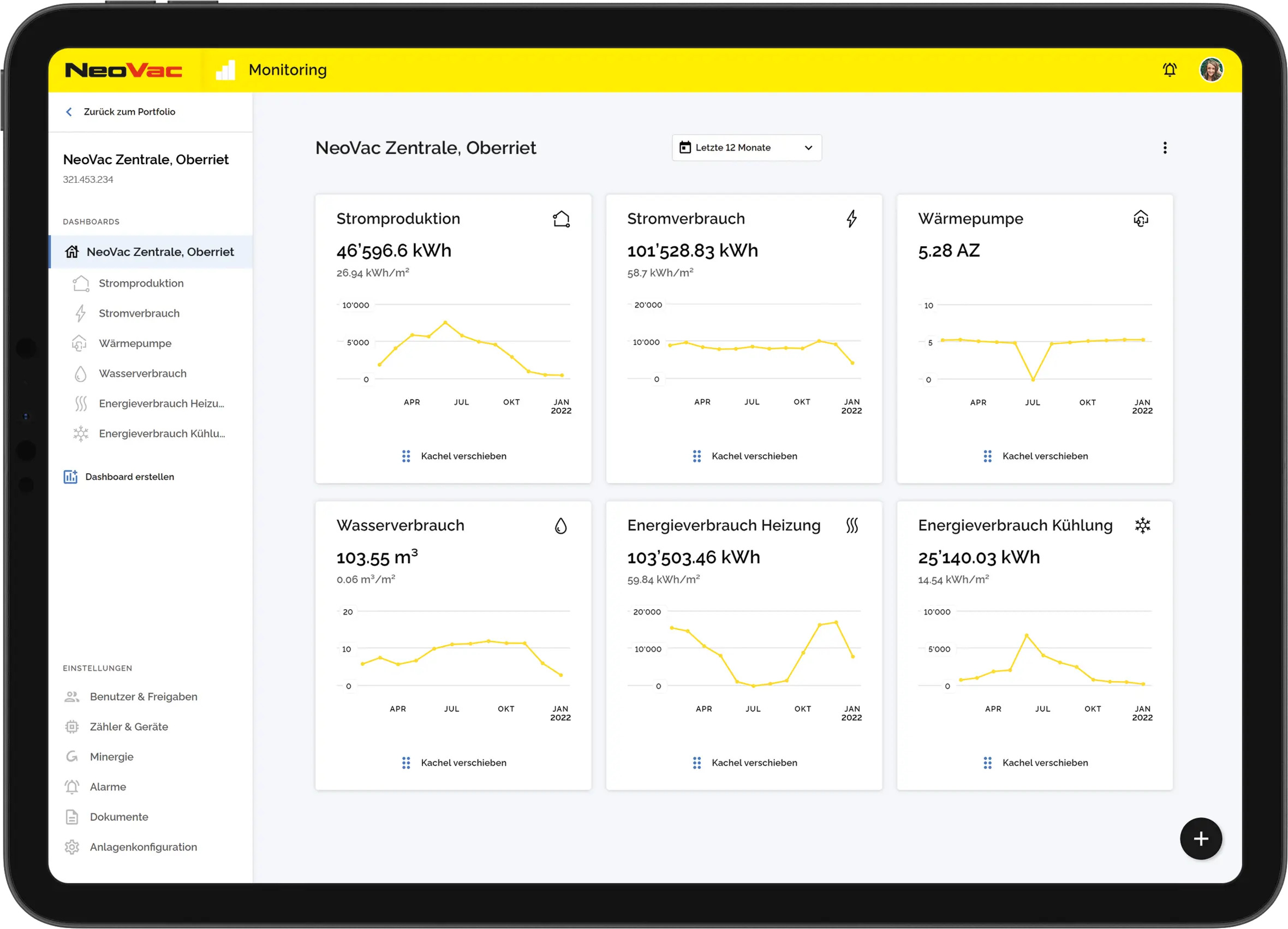 Zentrale Komponente ist die Plattform NeoVac Monitoring Pro. Sie erfasst Strom-, Wärme- und Wasserverbräuche in Echtzeit, analysiert die Daten automatisiert und visualisiert sie übersichtlich. Damit bildet sie die technische Grundlage für intelligentes Energiemanagement.
