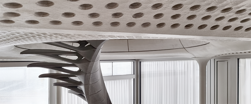 Eine digital gefertigte Treppe, die sich in den zweiten Stock windet. Eine perforierte Betondecke, die den Schall absorbiert. Boden- und Wandmaterialien aus rezyklierten Abfallstoffen. Die jüngste Unit im Forschungs- und Innovationsgebäude NEST der Empa vereint neue digitale Design- und Fertigungstechniken mit innovativen Materialien und einem umfassenden Energie- und Behaglichkeitskonzept.