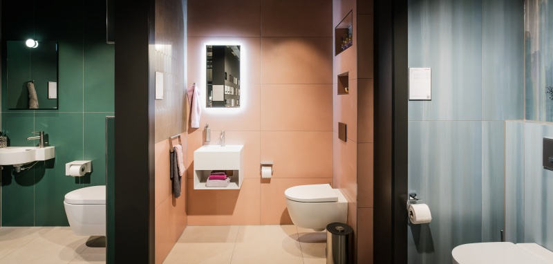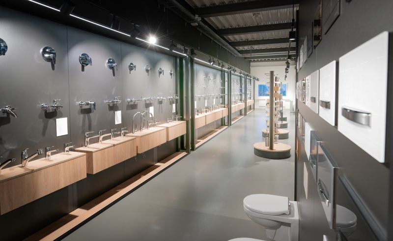 Vor Ort treffen die Besucherinnen und Besucher im Eingangsbereich auf sechs atmosphärische Präsentationen, auf denen gekonnt Produkte, Farben und Materialien zu inspirierenden Ideenquellen zusammengefügt sind. Ergänzend dazu finden sich in den drei Trendboxen stets die modernsten Produkte aus der Sanitär- und Plattenbranche. Sowohl die Präsentationsflächen als auch die Trendboxen werden laufend mit neuen Exponaten aktualisiert. Zum grossen Ganzen geht es auf der zweiten Etage der Ausstellung. Dort finden sich eingerichtete Badezimmer in verschiedenen Grössen, Stilrichtungen und Ausstattungen, allesamt in realitätsgetreuen Raummassen gehalten, auf dass das, was gefällt, auch im heimischen Bad noch passt.