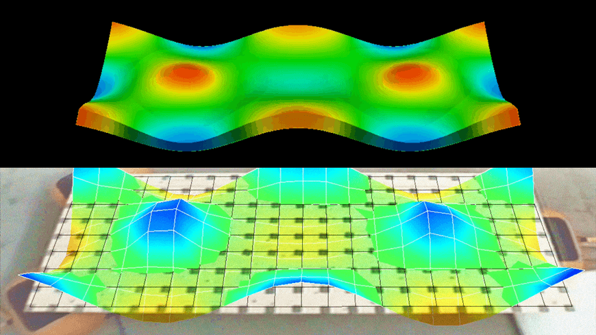 Die beiden Platten – einmal mit, einmal ohne akustische schwarze Löcher – wurden an der Empa einer Schwingungsanalyse unterzogen. Bei dieser Messung wird Schall über das ganze relevante Schallspektrum als Vibration in den Testkörper geleitet. Ein Laser misst die Vibration der Test-Platten rasterförmig an mehreren Stellen. Mit den Messwerten kann dann berechnet werden, wie sich die Vibration durch die Platte bewegt – und, ob die ausgefrästen Dellen den Schall auch wirklich «einfangen» und in Form von Wärme verpuffen lassen.