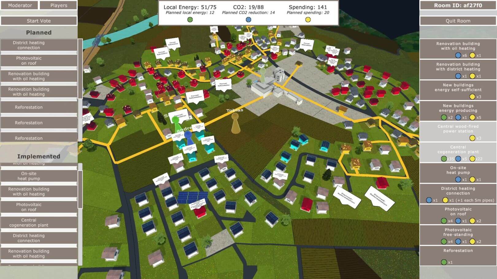 Das Spiel liefere dabei keine perfekten Lösungen, so Schulz weiter. «Politik, Energieversorger und Einwohnerschaft haben teilweise konträre Interessen. Es gilt einen Ausgleich zu finden zwischen den verschiedenen Gruppen, genau wie in der Realität», erläutert er: Reicht es beispielsweise, für wenig Geld Gebäude zu sanieren? Oder ist es doch besser, die Gebäude mit Solaranlagen zu bestücken? Diese senken den CO2-Vebrauch viel stärker, allerdings beeinträchtigen sie das Ortsbild und schaden damit unter Umständen dem Tourismus. Erst wenn im Team Konsens herrscht, welcher Schritt als Nächstes in Angriff genommen werden soll, geht das Spielt weiter.