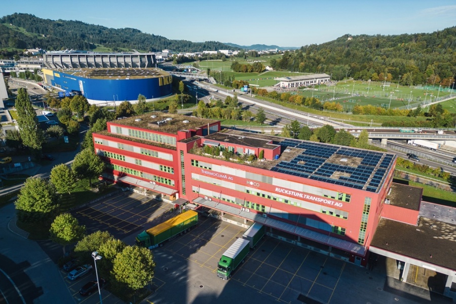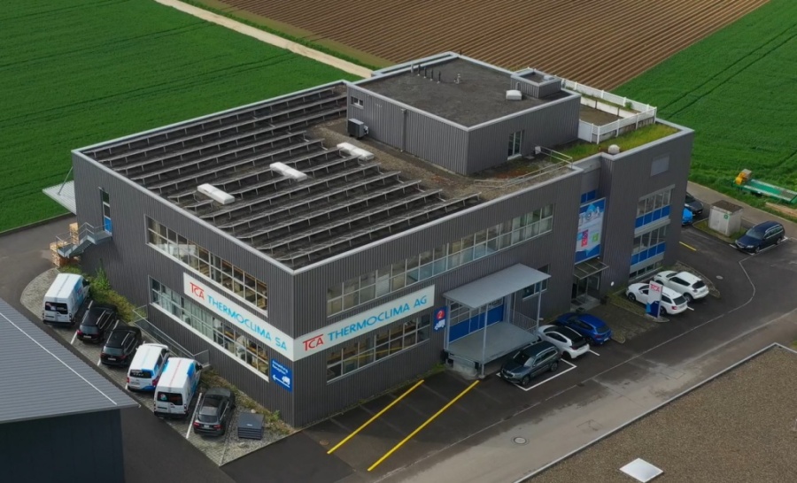 Flugaufnahme auf TCA-Thermoclima-Hauptsitz in St. Gallen mit Photovoltaik-Anlage auf dem Dach. (Fotos: TCA Thermoclima) -
