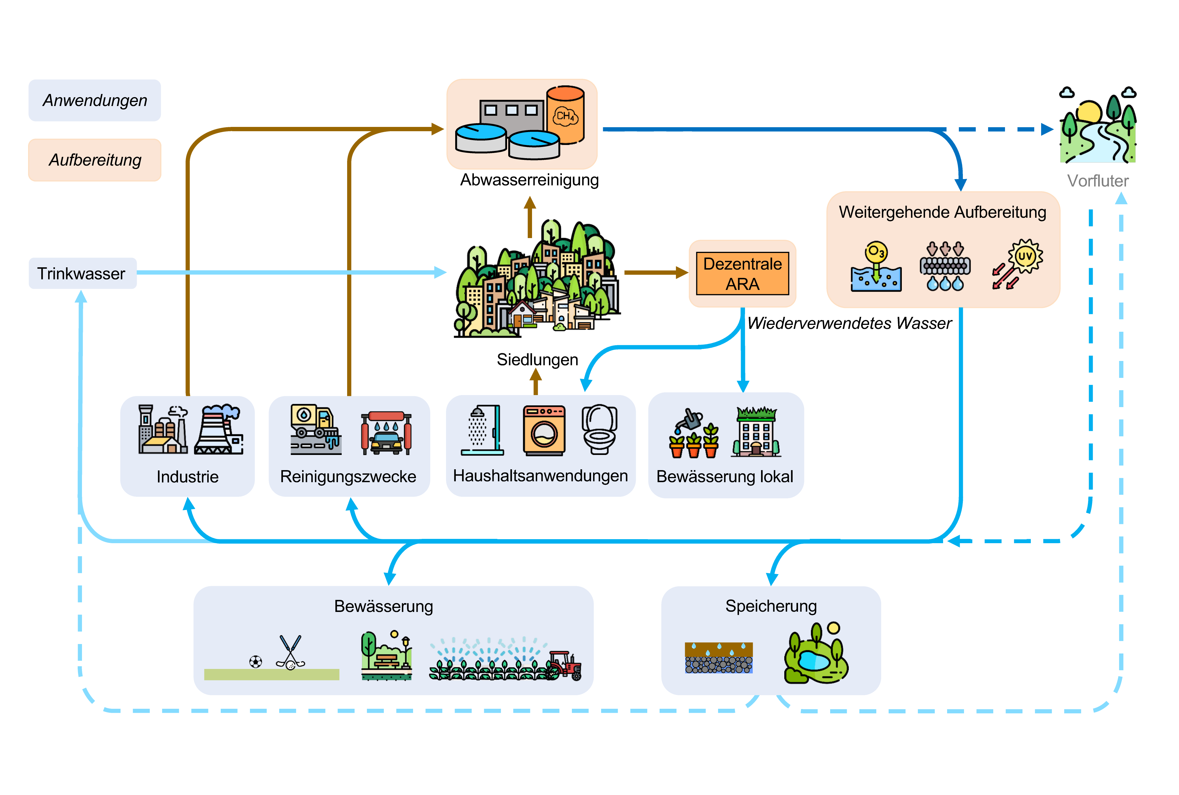 Das Wasserforschungsinstitut Eawag hat im Rahmen des kürzlich abgeschlossenen Projekts «Wasserwiederverwendung in der Schweiz» untersucht, ob dabei auch die Wiederverwendung von gereinigtem häuslichem Abwasser eine Option sein könnte. Dieses Wasser würde etwa für die Bewässerung von Landwirtschafts- und Grünflächen, im Haushalt für Waschmaschine und Toilettenspülung oder in der Industrie als Kühl- und Prozesswasser zur Verfügung stehen. Das reduziert die Wassermenge, die zur Deckung des Bedarfs aus dem Grundwasser oder aus Gewässern entnommen werden muss.