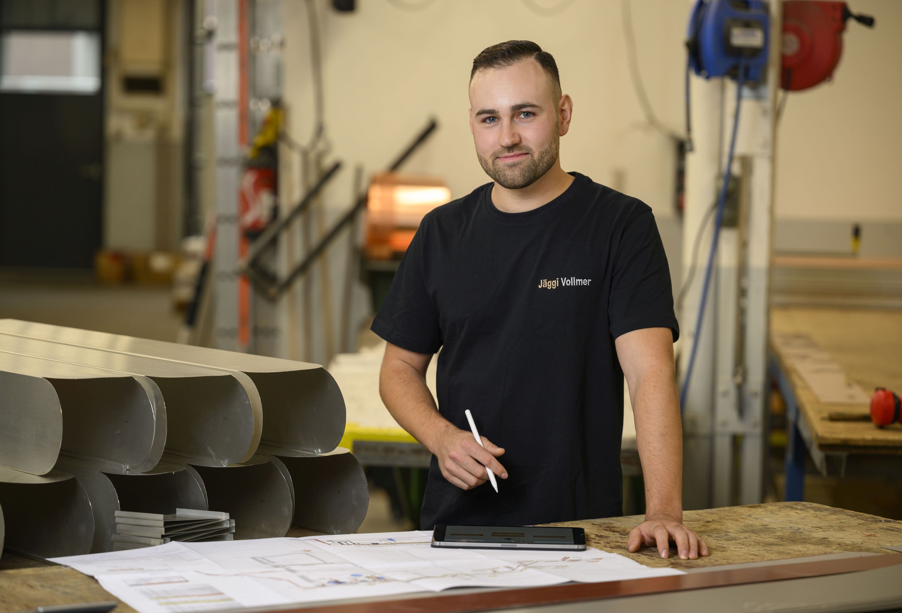 Robin Jäggi hat viel Zeit und Energie in die eigene Karriere gesteckt: Nach seiner Erstausbildung zum Möbelschreiner EFZ von 2012 bis 2016 sammelte er während eines Zwischenjahres neue praktische Erfahrungen als Sanitärinstallateur im elterlichen Betrieb und als Pontonier im Militär, bevor er eine Zweitlehre zum Gebäudetechnikplaner Sanitär EFZ begann. Diese schloss er bei der Rosenmund Haustechnik AG in Basel ab, wo er im Anschluss zum Projektleiter Sanitär aufstieg. 2023 führten ihn seine Wege wieder zurück zur Jäggi Vollmer GmbH. Zunächst war er als Projektleiter Sanitär angestellt. Ein Jahr später folgte die Rolle des Geschäftsführers.